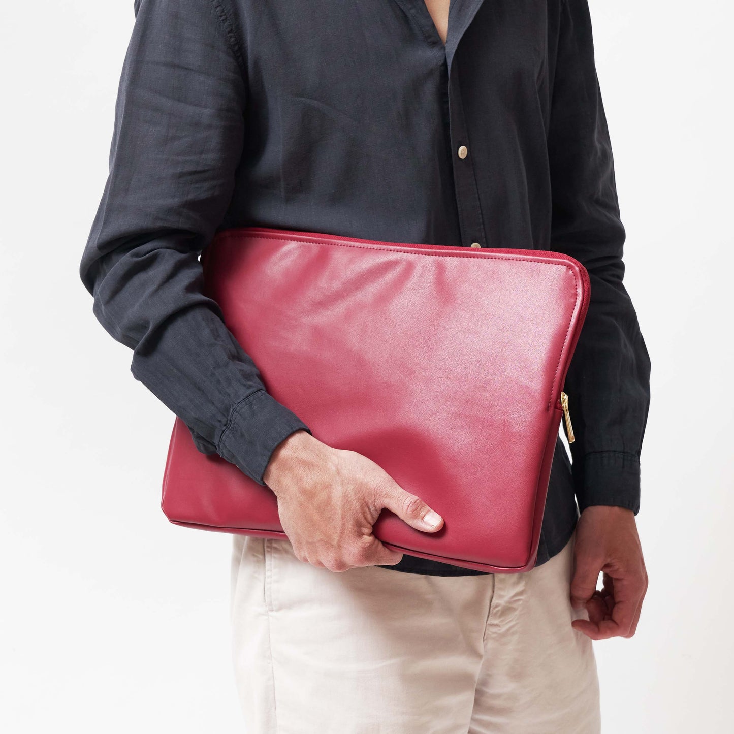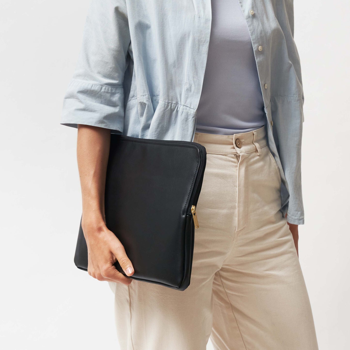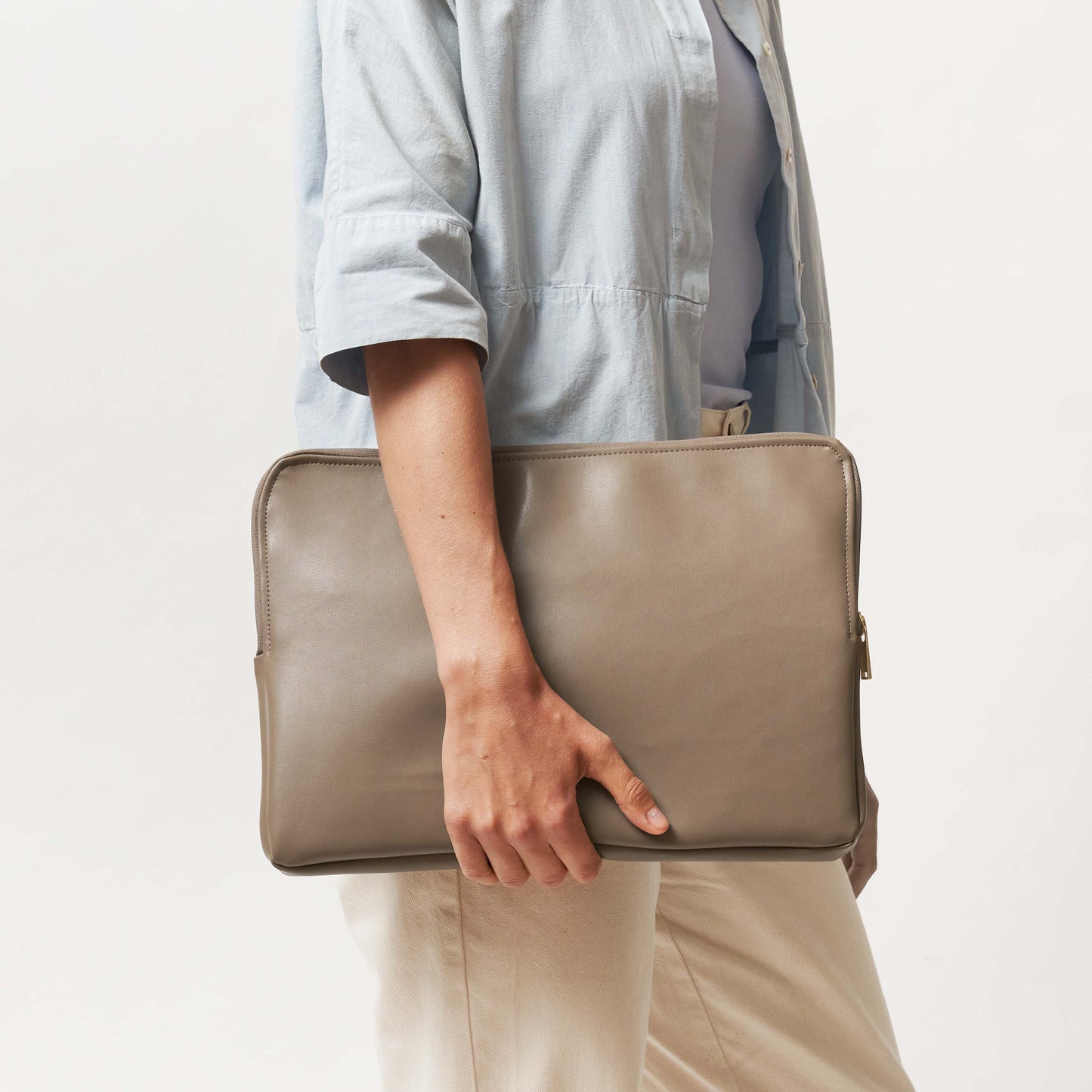 Das Laptop Sleeve wird aus der innovativen, veganen Lederalternative Oleatex gefertigt. Es bietet Platz für Laptops bis zu 15 Zoll und schützt dank weicher Polsterung zuverlässig im Alltag. Zwei offene Fächer sorgen für Struktur und bieten Platz für kleine Alltagsgegenstände. Zeitlos im Design und hochwertig verarbeitet ist es der perfekte Begleiter fürs Büro oder für unterwegs.